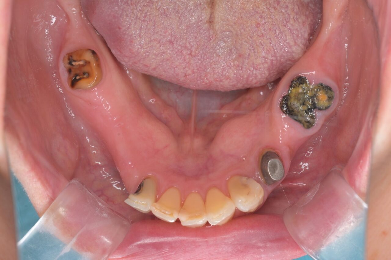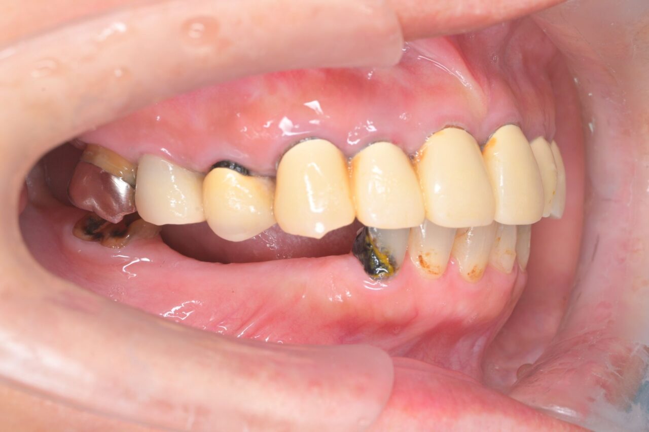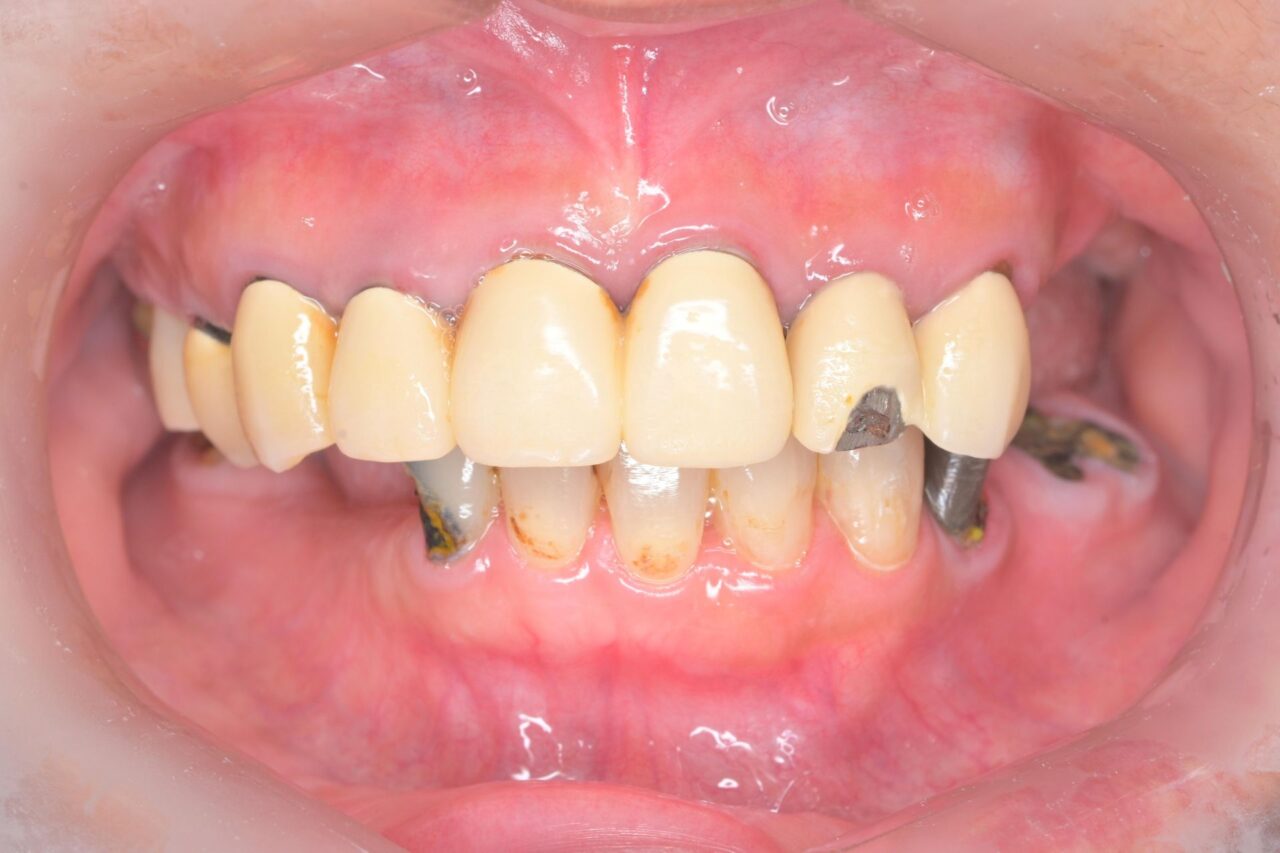 奥歯がありません。歯ぐきの際が黒くなっています。前歯があるので不格好にはならないのですが、奥歯=大黒柱が無い状態です。奥歯が無いことによって、かみ合わせが深くなってしまい、顎関節にも負担がかかっている状況です。
