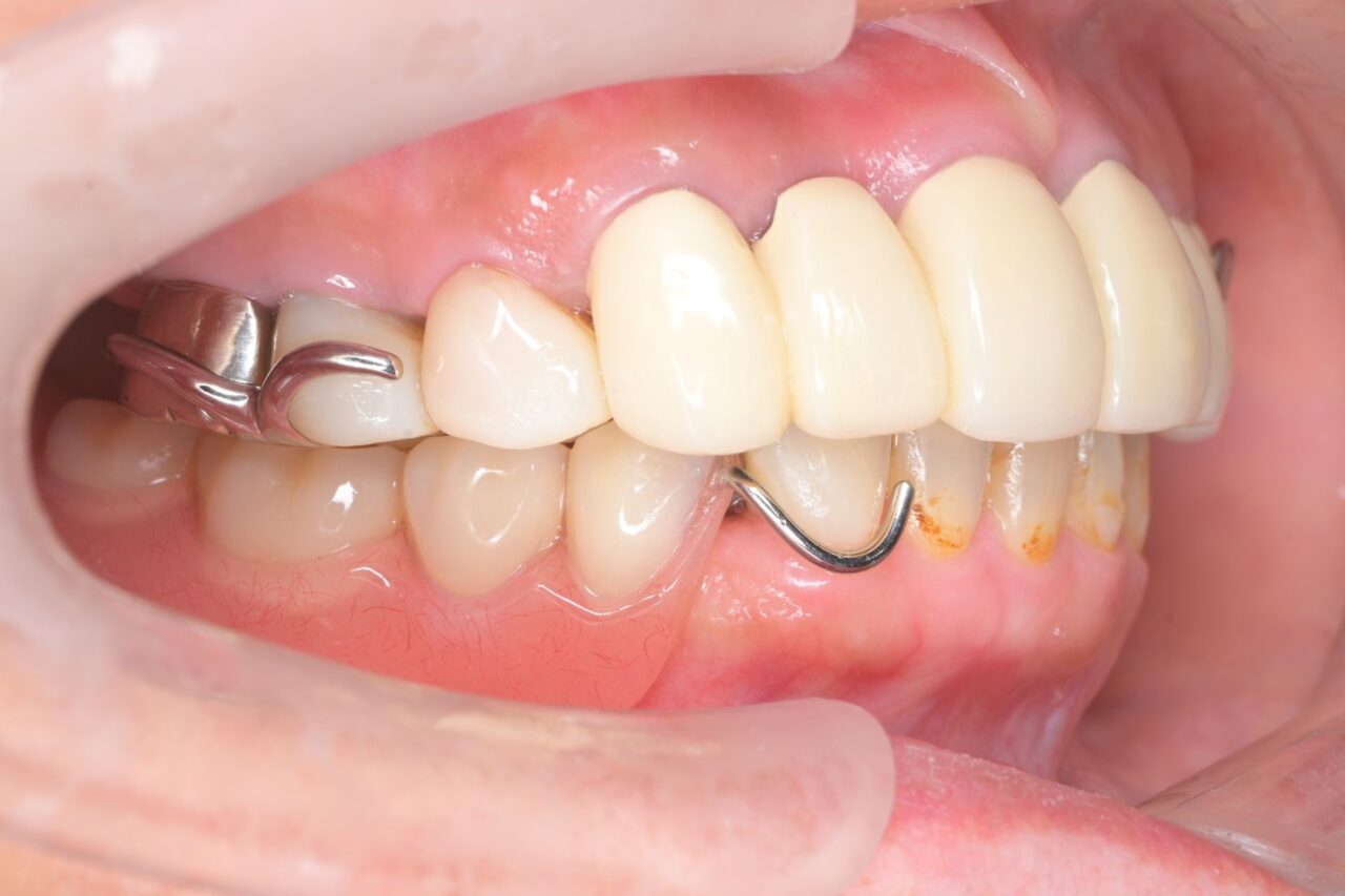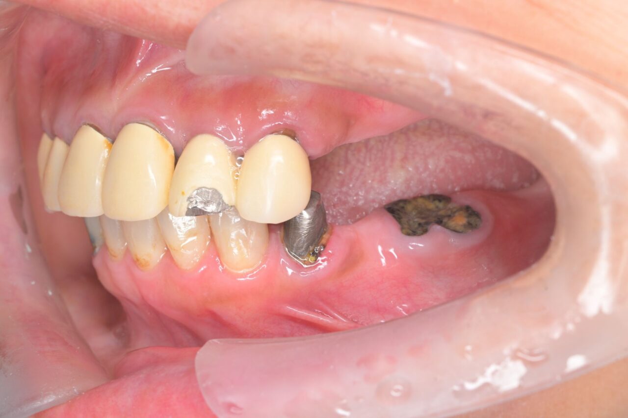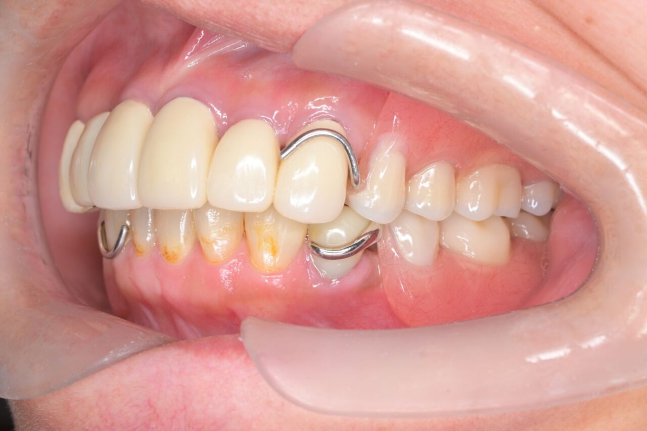 奥歯がありません。歯ぐきの際が黒くなっています。前歯があるので不格好にはならないのですが、奥歯=大黒柱が無い状態です。奥歯が無いことによって、かみ合わせが深くなってしまい、顎関節にも負担がかかっている状況です。