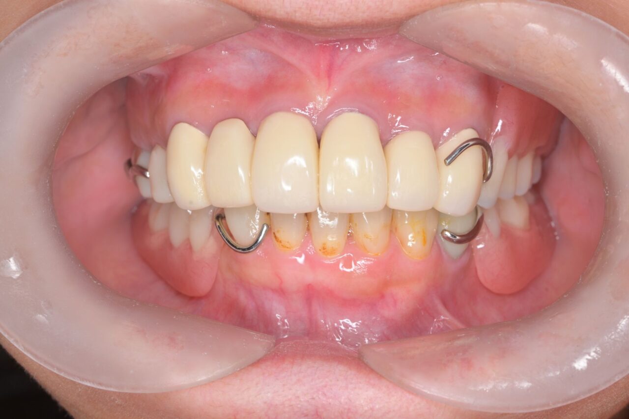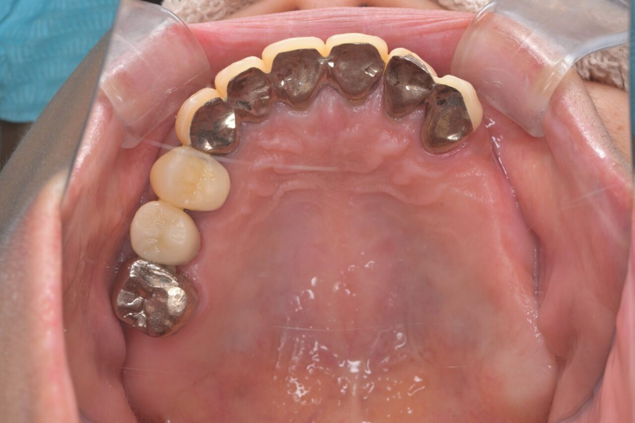 上の歯はフロスが通るように1本ずつ単冠で治療しています。
