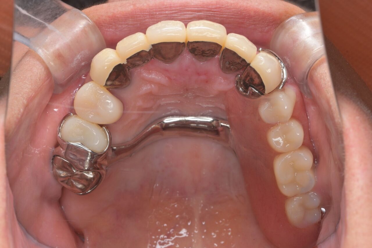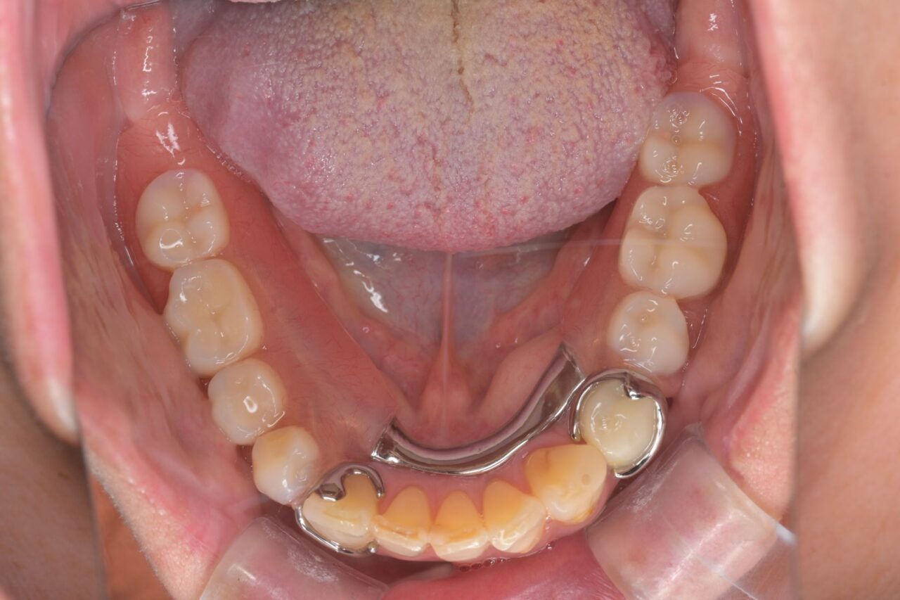 左右の入れ歯を金属でつないで強固にしています。はじめは舌感が悪いと思いますが、慣れが必要です。