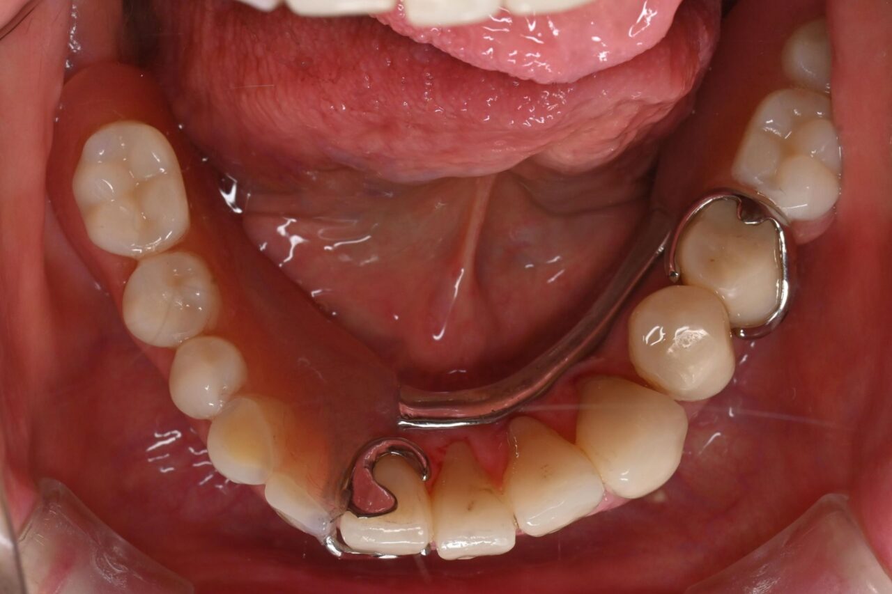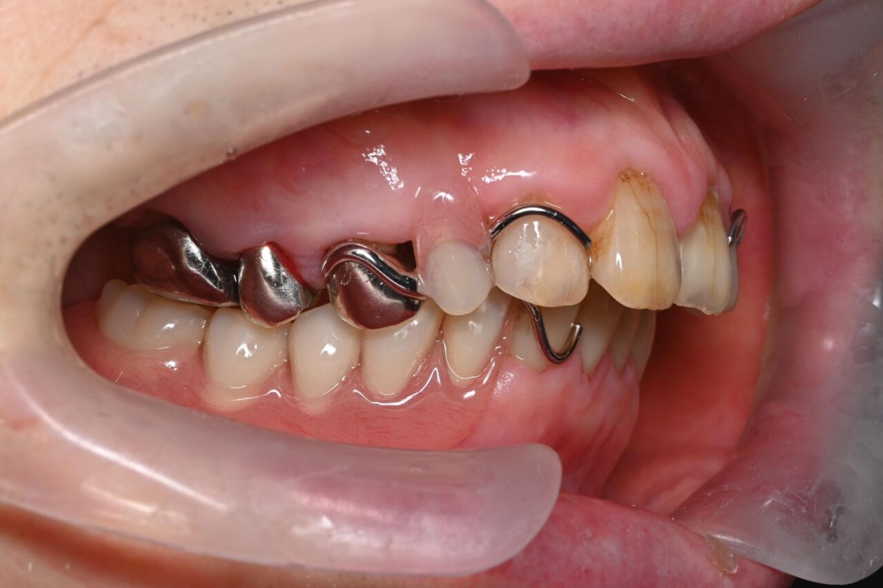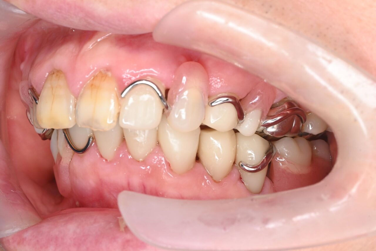 入れ歯のバネ(銀色)が目立ちますが、保険の義歯なので仕方ないです。自費の入れ歯にすれば見た目はさらに改善します。